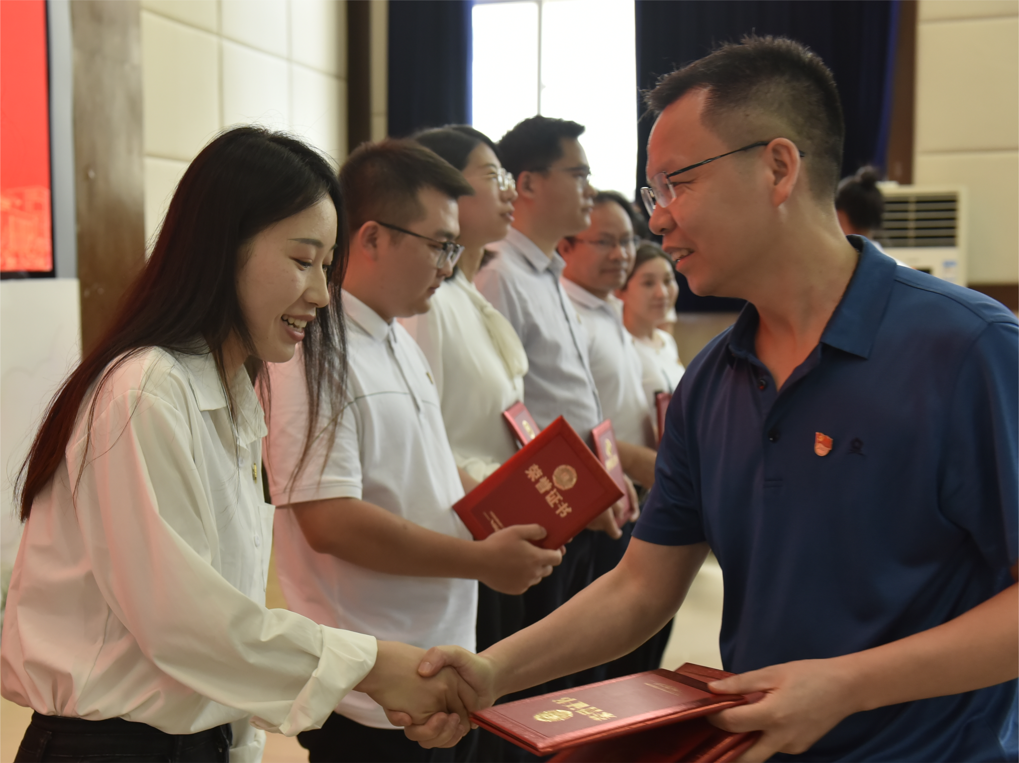 学院党委负责同志为新发展党员代表佩戴党员徽章。全体新发展党员面对鲜红的党旗,高举右拳,庄严宣誓,“我志愿加入中国共产党,拥护党的纲领……”誓言铿锵有力,承诺掷地有声。