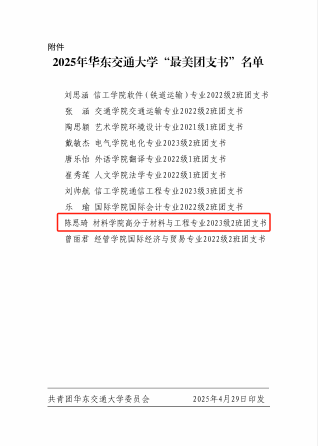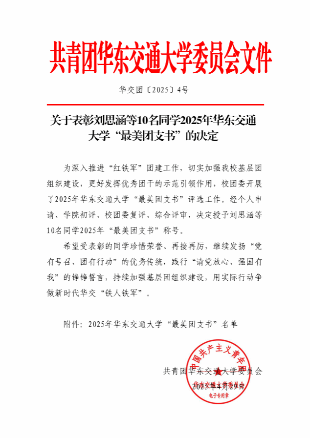 学团工作 当前位置: 首页 > 学团工作 > 正文 喜报|我院陈思琦同学获得2025年华东交通大学“最美团支书”称号 2025-05-12 18:50 为深入推进“红铁军”团建工作,切实加强我校基层团组织建设,更好发挥优秀团干的示范引领作用,校团委开展了2025年华东交通大学“最美团支书”评选工作。望受表彰的同学珍惜荣誉、再接再厉,继续发扬“党有号召、团有行动”的优秀传统,践行“请党放心、强国有我”的铮铮誓言,持续加强基层团组织建设,用实际行动争做新时代华交“铁人铁军”。一审一校:罗志亮 陈楠 二审二校:武磊 黄培凤 三审三校:胡国庆