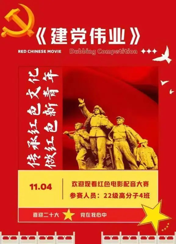 为深入学习贯彻中国共产党第二十次全国代表大会精神,材料学院红色螺丝钉工作室将于11月11日(周五)19:00在天佑会堂举行2022年红色电影配音大赛(决赛)。学院各学生党支部及新生班级以3~10人为单位组成参赛队伍进行参赛,参赛队伍自备无人声有字幕视频且时长不超过八分钟。
