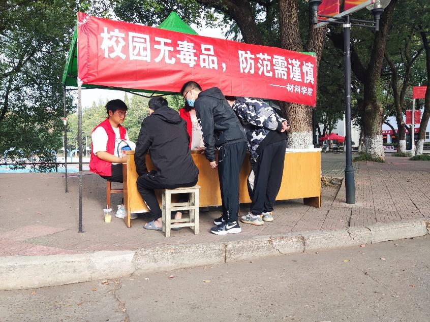 在南区一食堂对面进行宣传。发放宣传单给过往的同学,向来往的同学宣传一些新型毒品的相关知识;及处于新时代下,毒品的伪装发展迅速,志愿者们为同学讲解,让同学们尽可能了解到现在新型毒品可能的样式。同时,现场也开展了小型禁毒知识答题活动,通过小试卷的形式加强同学们对毒品防范的意识,在完成答卷后赠送其小礼品,推动更多同学来了解禁毒相关知识,更好的保护自身。