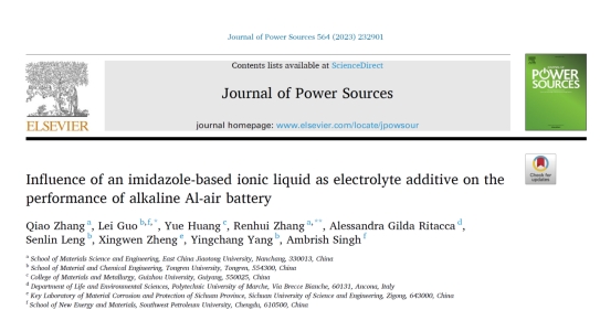 我院润滑腐蚀与防护课题组张仁辉副教授与贵州省锰系新能源材料重点实验室郭雷教授联合指导硕士研究生张巧以第一作者、华东交通大学为第一单位在咪唑基离子液体作为电解质添加剂对碱性铝-空气电池性能研究中取得新进展。研究工作发表在Journal of Power Sources (SCI一区,IF: 9.794)(https://doi.org/10.1016/j.jpowsour.2023.232901)