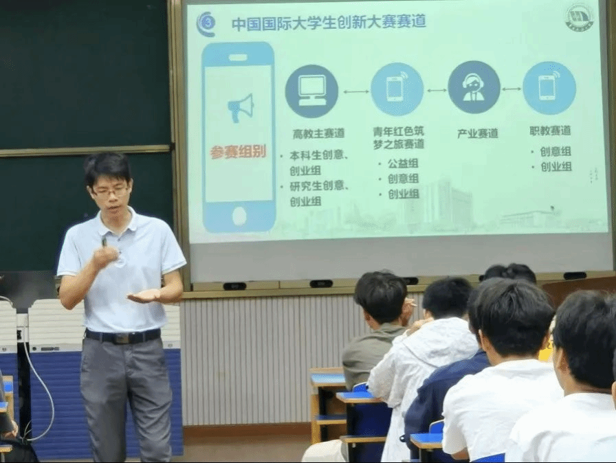 刘建平老师介绍了国家及学校对于大学生创新创业的支持和列举了中国大学生创业大赛获奖案例,以此来鼓励材料学院2024级新生们组成团队,共同完成创新创业项目。