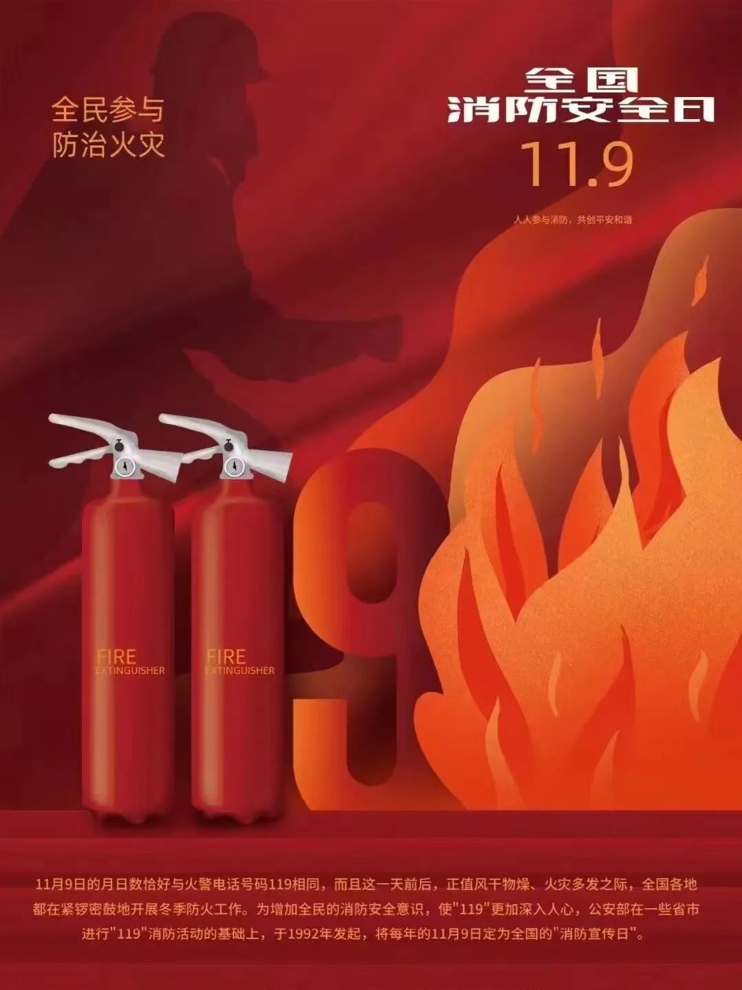 “消防”即是消除隐患,预防灾患。为增加全民的消防安全意识,使“119”更加深入人心,1992年,公安部将每年的11月9日定为“全国消防日”。