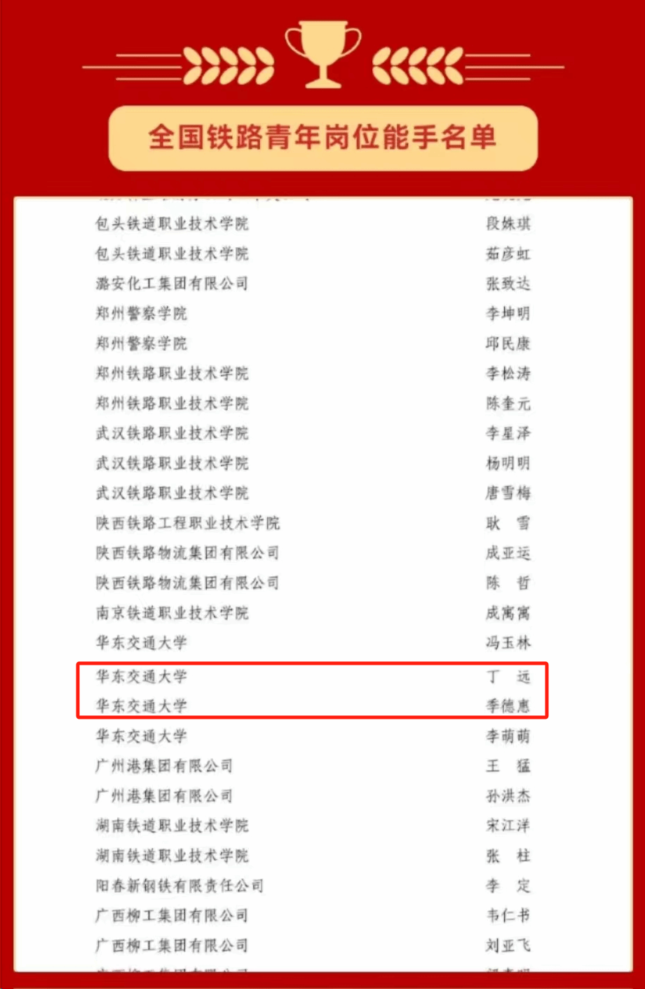 喜报:祝贺我院丁远、季德惠两位老师荣获“全国铁路青年岗位能手”荣誉称号!