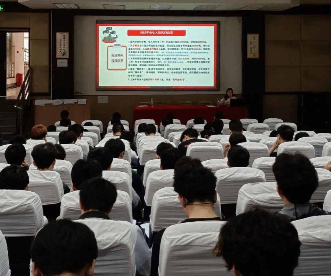 会上,校武装部的王聪老师向学生们介绍了男性毕业生参军的优抚政策。根据介绍,男性本专科毕业生年满18至24周岁,研究生不超过26周岁,都符合报名条件。参军入伍的学生将享受退大学期间学费的补偿,每年本科最高不超过16000元,研究生最高为20000元。此外,各地区还设立了奖励制度,以鼓励学生参军入伍。