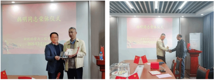 仪式伊始,学院领导及材控系主任分别致辞。院长沈明学教授深情回顾了韩明老师对我院的卓越贡献,称赞他“以严谨治学的态度、春风化雨的教学风范,培养了一代代优秀学子,为学科发展和学院建设做出了不可替代的贡献”。党委书记赵龙志教授动情表示:“韩老师不仅是学生的引路人,更是青年教师的榜样。他的敬业精神与人格魅力,深深镌刻在学院发展的里程碑上。”材控系主任焦海涛老师则细数韩老师扎根教学科研一线的点滴,感怀他“用热爱与坚守诠释了师者的初心”。