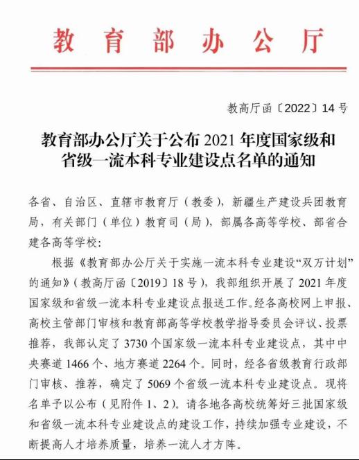 近日,教育部办公厅发布了《关于公布 2021 年度国家级和省级一流本科专业建设点名单的通知》(教高厅函〔2022〕14号),我院材料成型及控制工程专业获批2021年度国家一流本科专业建设点。此前,材料成型及控制工程和高分子材料与工程专业均获批省级一流专业建设点,学院2个专业分别获批国家级、省级一流专业建设点。