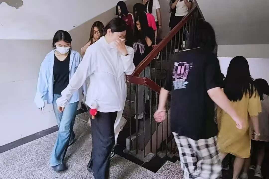 随着警报信号发出,演练正式开始。在楼层安全员的引导下,同学们迅速掌握防护要点,用湿毛巾捂住口鼻、弯腰低姿,按照指定路线快速有序撤离至操场集合点。300余名学生有序迅速完成疏散,整个过程规范高效,未出现拥挤、踩踏等意外情况。