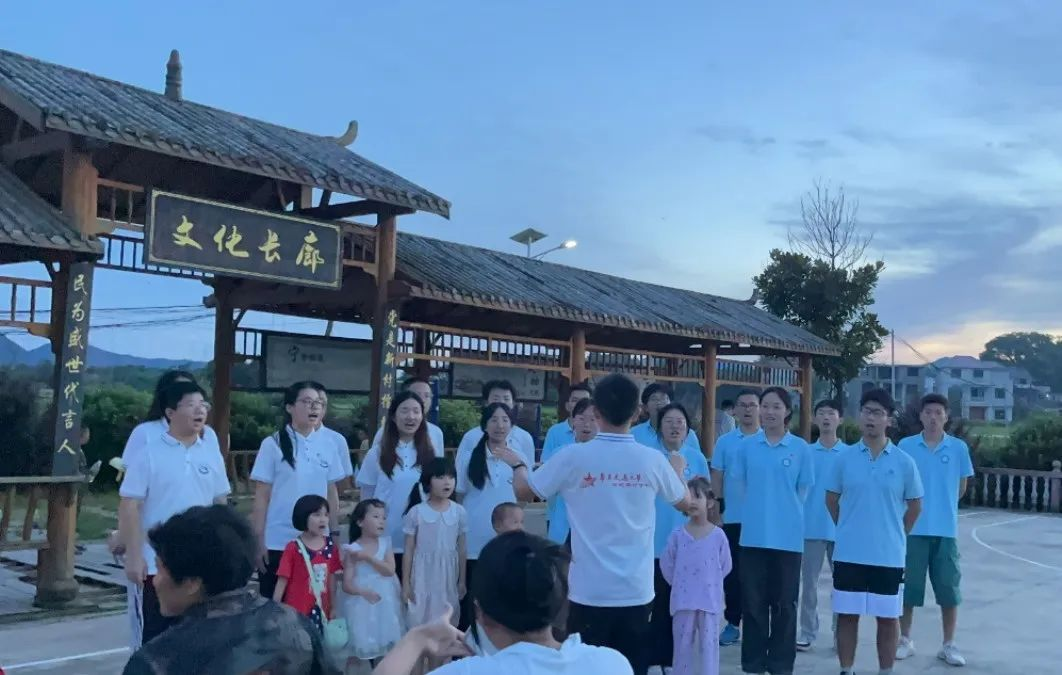 傍晚时分,志愿服务队和校世纪英才五班在村里的文化长廊一起为村民合唱《没有共产党就没有新中国》,赞扬了中国共产党,赞扬了中国共产党一心为民、一心为国的精神。