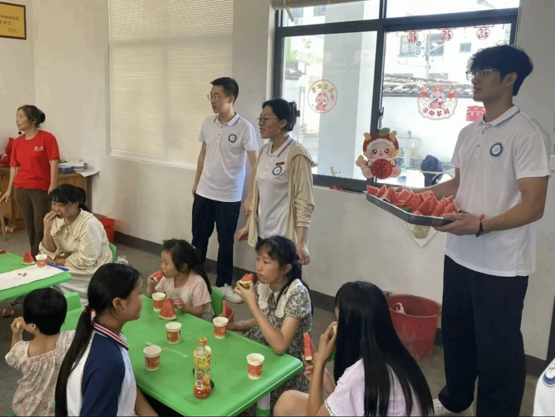 在活动期间,实践团成员们将事先准备好的西瓜分发给每一个孩子,希望能够为他们提供营养补给,帮助孩子们拥有更好的学习状态和身体健康。